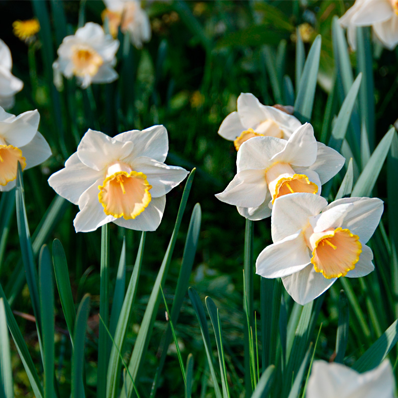 Plantés en pleine terre, les bulbes de narcisses n’ont pas besoin d’entretien particulier, mais juste d’un peu de patience car ils mettront quelques semaines avant de sortir de terre et d’illuminer vos massifs aux premiers beaux jours du printemps. Ils ne nécessitent ni engrais ni arrosage en début de culture, car ils fleurissent sur leurs réserves et bénéficient de l’eau qui tombe naturellement du ciel à cette saison. Veillez simplement à maintenir la terre fraiche en cours de floraison, particulièrement si une période de sécheresse intervient au moment de l’épanouissement des fleurs. Après la floraison, supprimez les fleurs fanées pour éviter que les bulbes ne s’épuisent en produisant des graines, mais prenez soin de ne pas couper le feuillage avant qu’il ait fini de jaunir naturellement. Après avoir coupé les fleurs, un apport d’engrais pourra également aider le bulbe à reconstituer ses réserves pour refleurir généreusement l’année suivante. Les narcisses sont rustiques et peuvent rester en terre d’une année sur l’autre. Ils se naturalisent également très facilement, particulièrement les narcisses botaniques qui formeront rapidement des touffes compactes et denses