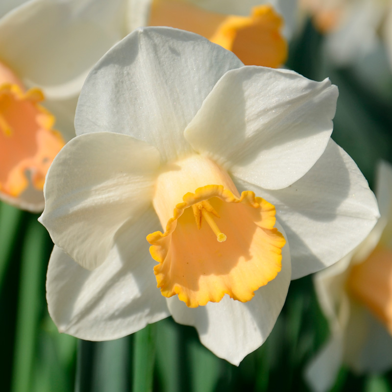 Le Narcisse Grande Coupe Salomé est une magnifique bulbeuse de 40 cm de hauteur, qui produit en avril des fleurs de 8 cm de diamètre au coloris blanc à la coupe rose saumoné pâle. Planté en groupe resserré, ce narcisse à la trompette large et évasée sera spectaculaire en massif ou en bordure, mais aussi en vase où il composera de magnifiques bouquets printaniers. En pot ou jardinière, cette variété sublimera vos balcons et terrasses en association avec d’autres bulbeuses à floraison hâtive comme les tulipes Triomphe, les muscaris ou les jacinthes orientales. Une chose est sûre, ces narcisses lumineux à la floraison durable signeront l’arrivée du printemps au jardin !
