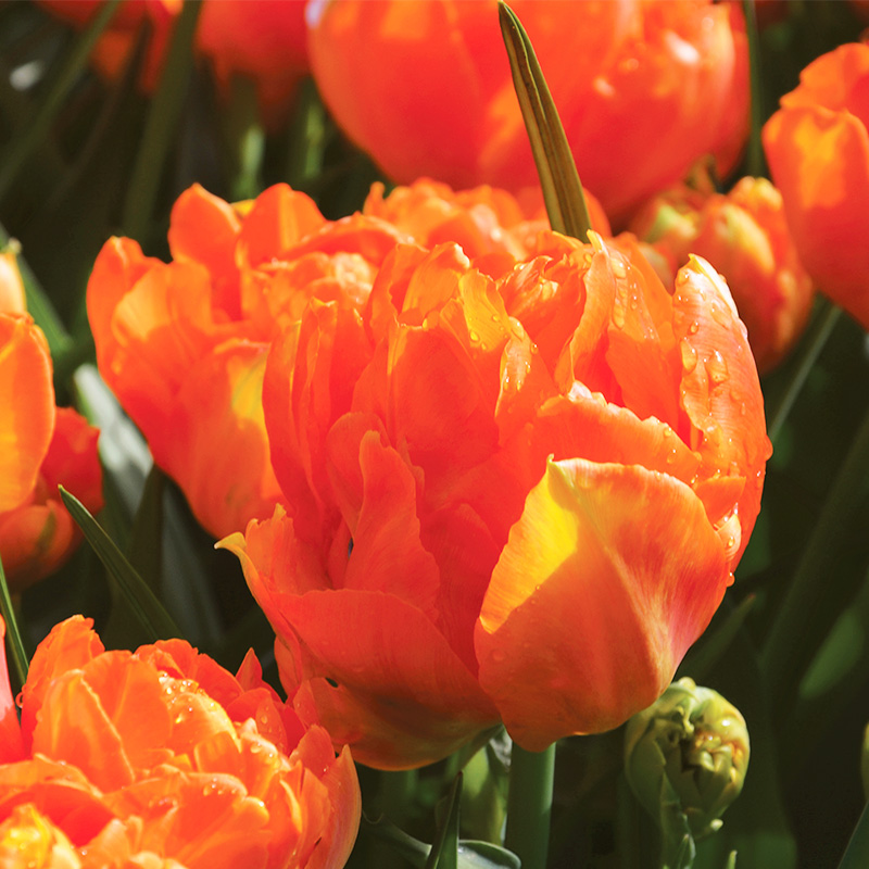 La tulipe double hâtive Orca est une jolie bulbeuse de 40 cm de hauteur qui s’épanouit en avril, en dévoilant une floraison double et spectaculaire de 10 cm de diamètre, au coloris orange clair teinté de mandarine. Avec sa floraison généreuse et précoce, elle sera sublime en massif ou plate-bande, pour créer une tache de couleur spectaculaire ou pour donner de la hauteur de manière plus diffuse et naturelle à une composition de vivaces de printemps ou de bisannuelles. Réservez-lui un endroit abrité du jardin car ses fleurs très doubles peuvent être fragilisées par les grands vents. En grand pot, elle sublimera vos balcons et terrasses en association avec d’autres bulbeuses à floraison hâtive comme les crocus, muscaris ou les narcisses botaniques. En vase, cette tulipe double hâtive fera entrer une touche bohème chic dans votre intérieur.