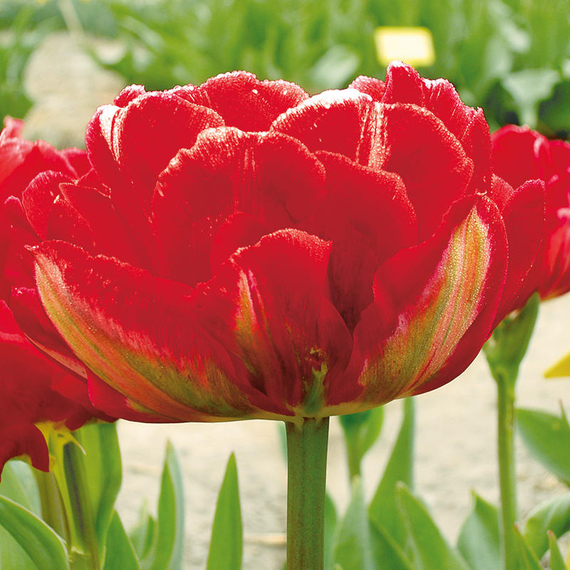 La tulipe double hâtive Pamplona est une jolie bulbeuse de 40 cm de hauteur qui s’épanouit en avril, en dévoilant une floraison double et spectaculaire de 15 cm de diamètre, au coloris rouge éclatant et possédant une nervure verte sur l’extérieur.