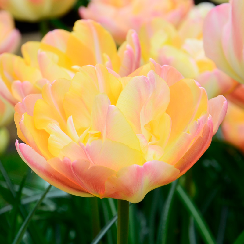 La tulipe double tardive Crème Upstar est une jolie bulbeuse de 40 cm de hauteur qui s’épanouit fin avril début mai, en dévoilant une floraison double et spectaculaire de 11 cm de diamètre, au coloris jaune doux nuancé de reflets rose abricot. Avec ses fleurs telles des pivoines, cette variété sera sublime en massif ou plate-bande, pour créer une tache de couleur spectaculaire ou pour donner de la hauteur de manière plus diffuse et naturelle à une composition de vivaces de printemps ou de bisannuelles. Réservez-lui un endroit abrité du jardin car ses fleurs très doubles peuvent être fragilisées par les grands vents surtout après une averse. En grand pot ou bac, elle sublimera vos balcons et terrasses en association avec d’autres bulbeuses à floraison printanière comme les narcisses doubles ou les anémones blanda. En vase, cette tulipe double tardive fera entrer une touche bohème chic dans votre intérieur.
