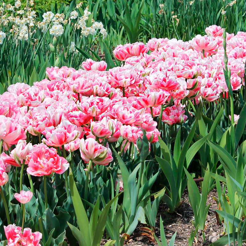 La tulipe double tardive Finola est une jolie bulbeuse de 45 cm de hauteur qui s’épanouit fin avril début mai, en dévoilant une floraison double et spectaculaire de 12 cm de diamètre, au coloris tout en camaïeu de roses et plus ou moins strié de vert. Avec ses fleurs telles des pivoines, cette variété sera sublime en massif ou plate-bande, pour créer une tache de couleur spectaculaire ou pour donner de la hauteur de manière plus diffuse et naturelle à une composition de vivaces de printemps ou de bisannuelles. Réservez-lui un endroit abrité du jardin car ses fleurs très doubles peuvent être fragilisées par les grands vents surtout après une averse. En grand pot ou bac, elle sublimera vos balcons et terrasses en association avec d’autres bulbeuses à floraison printanière comme les narcisses doubles ou les anémones blanda. En vase, cette tulipe double tardive fera entrer une touche bohème chic dans votre intérieur.