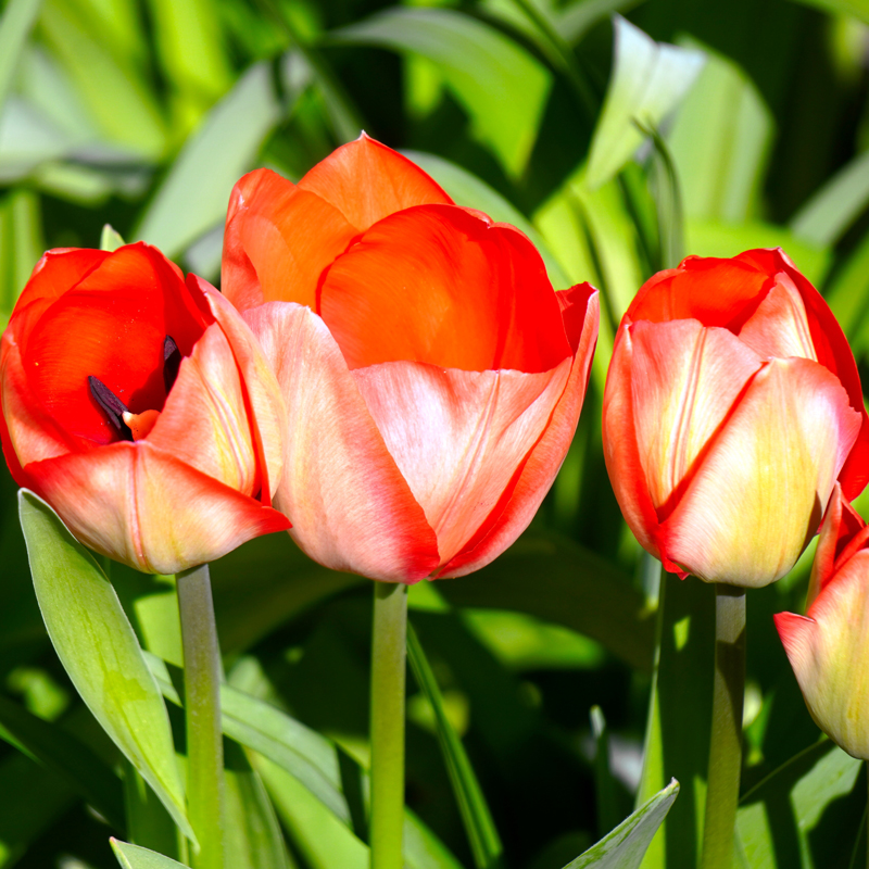 Une fois plantés, les bulbes de tulipes n’ont pas besoin d’entretien particulier, mais juste d’un peu de patience car ils mettront quelques semaines avant de sortir de terre. Les bulbes de tulipe ne nécessitent ni engrais ni arrosage en début de culture, car ils fleurissent sur leurs réserves et bénéficient de l’eau qui tombe naturellement du ciel à cette saison. Veillez simplement à maintenir la terre fraiche en cours de floraison, particulièrement si une période de sécheresse intervient au moment de l’épanouissement des boutons floraux. Après la floraison, supprimez les fleurs fanées pour éviter que les bulbes ne s’épuisent en produisant des graines, mais prenez soin de ne pas couper le feuillage avant qu’il ait fini de jaunir naturellement. Cette phase cruciale, associée dans l’idéal à un apport d’engrais une fois les fleurs fanées, est indispensable pour entretenir le feuillage et permettre au bulbe de reconstituer ses réserves pour refleurir généreusement l’année suivante. C’est particulièrement le cas pour les variétés de tulipes horticoles, dont la qualité de la floraison peut s’amoindrir année après année. Les bulbes de tulipes sont rustiques et peuvent rester en place durant l’hiver, dans la mesure où votre sol est suffisamment drainant. Il n’est donc pas nécessaire de sortir vos bulbes de terre à la fin de la floraison, particulièrement pour les tulipes botaniques qui se naturalisent très facilement pour former rapidement des touffes de plus en plus abondantes. Après quelques années, si la floraison dégénère, il sera nécessaire de la renouveler en plantant de nouveaux bulbes.