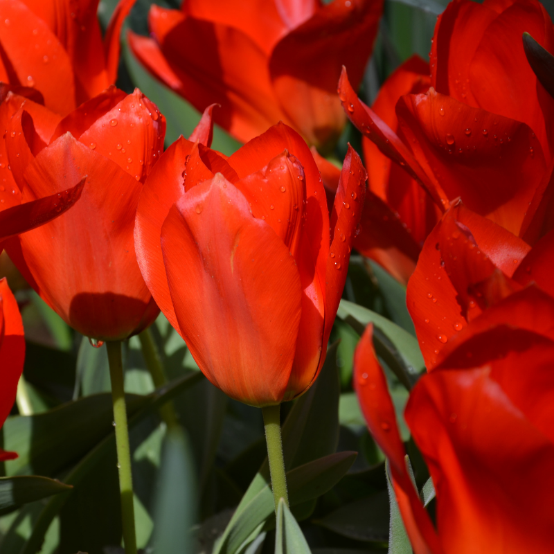 La plantation des tulipes est un jeu d’enfants ! Ce sont des bulbeuses très faciles à réussir qui se plaisent dans tout sol pour peu qu’il soit drainant car elles redoutent les excès d’eau. Si votre terre est trop lourde, faites un apport de sable ou de terreau pour l’alléger et en améliorer le drainage. Les tulipes apprécient les expositions ensoleillées, mais se plairont aussi dans des endroits mi-ensoleillés du jardin. Réservez-leur un endroit abrité des vents forts, surtout pour les variétés les plus hautes. Les tulipes se plantent à l’automne, et ont besoin de passer l’hiver en terre pour bien fleurir le printemps suivant. Plantez vos bulbes, pointe vers le haut, dans une terre bien ameublie, à environ 12 / 15 cm de profondeur. Pour les tulipes botaniques, dont les bulbes sont généralement plus petits, plantez moins profond. D’une manière générale, recouvrez vos bulbes sous une épaisseur de terre d’environ 1,5 à 2 fois la hauteur du bulbe. Selon l’effet souhaité, plantez vos bulbes en groupe dense, distancés de 10 à 12 cm environ, pour créer de magnifiques taches de couleurs au jardin. Sinon, plantez de manière plus diffuse et aléatoire à travers vos plates-bandes de vivaces ou de bisannuelles pour un effet plus naturel. Les tulipes peuvent également se planter en pot pour illuminer vos balcons et terrasses. Dans ce cas, choisissez un contenant d’un bon diamètre et d’une bonne profondeur, et positionnez dans le fond un lit de gravier ou de billes d’argiles pour favoriser le drainage. Comme en pleine terre, respectez la bonne profondeur de plantation, et n’hésitez pas à les associer à d’autres bulbes à floraison printanière comme des narcisses, jacinthes, crocus ou encore muscaris. Après la plantation, arrosez pour favoriser la bonne adhérence de la terre autour des bulbes.