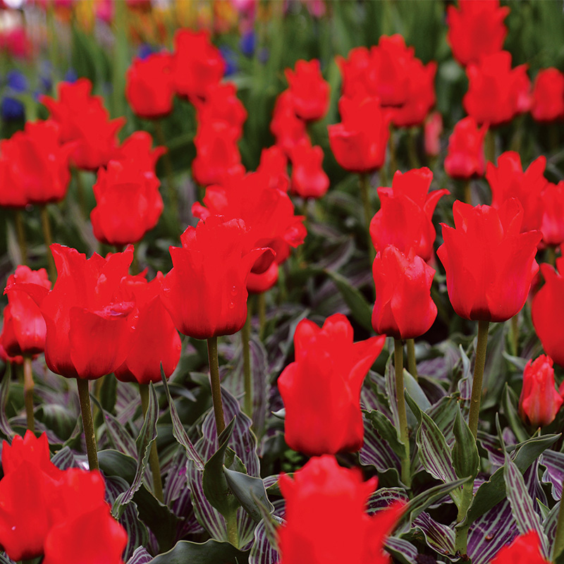 Une fois plantés, les bulbes de tulipes n’ont pas besoin d’entretien particulier, mais juste d’un peu de patience car ils mettront quelques semaines avant de sortir de terre. Les bulbes de tulipe ne nécessitent ni engrais ni arrosage en début de culture, car ils fleurissent sur leurs réserves et bénéficient de l’eau qui tombe naturellement du ciel à cette saison. Veillez simplement à maintenir la terre fraiche en cours de floraison, particulièrement si une période de sécheresse intervient au moment de l’épanouissement des boutons floraux. Après la floraison, supprimez les fleurs fanées pour éviter que les bulbes ne s’épuisent en produisant des graines, mais prenez soin de ne pas couper le feuillage avant qu’il ait fini de jaunir naturellement. Cette phase cruciale, associée dans l’idéal à un apport d’engrais une fois les fleurs fanées, est indispensable pour entretenir le feuillage et permettre au bulbe de reconstituer ses réserves pour refleurir généreusement l’année suivante. C’est particulièrement le cas pour les variétés de tulipes horticoles, dont la qualité de la floraison peut s’amoindrir année après année. Les bulbes de tulipes sont rustiques et peuvent rester en place durant l’hiver, dans la mesure où votre sol est suffisamment drainant. Il n’est donc pas nécessaire de sortir vos bulbes de terre à la fin de la floraison, particulièrement pour les tulipes botaniques qui se naturalisent très facilement pour former rapidement des touffes de plus en plus abondantes. Après quelques années, si la floraison dégénère, il sera nécessaire de la renouveler en plantant de nouveaux bulbes.