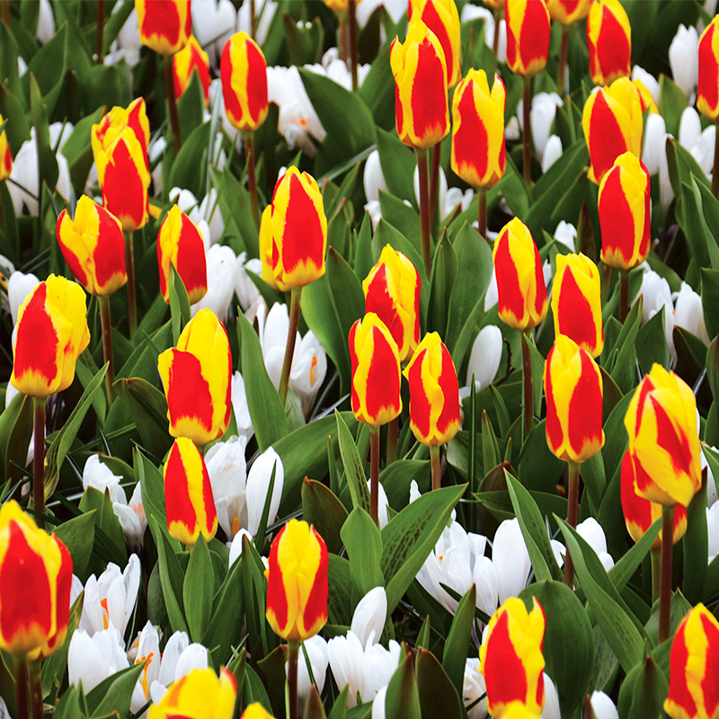 La plantation des tulipes est un jeu d’enfants ! Ce sont des bulbeuses très faciles à réussir qui se plaisent dans tout sol pour peu qu’il soit drainant car elles redoutent les excès d’eau. Si votre terre est trop lourde, faites un apport de sable ou de terreau pour l’alléger et en améliorer le drainage. Les tulipes apprécient les expositions ensoleillées, mais se plairont aussi dans des endroits mi-ensoleillés du jardin. Réservez-leur un endroit abrité des vents forts, surtout pour les variétés les plus hautes. Les tulipes se plantent à l’automne, et ont besoin de passer l’hiver en terre pour bien fleurir le printemps suivant. Plantez vos bulbes, pointe vers le haut, dans une terre bien ameublie, à environ 12 / 15 cm de profondeur. Pour les tulipes botaniques, dont les bulbes sont généralement plus petits, plantez moins profond. D’une manière générale, recouvrez vos bulbes sous une épaisseur de terre d’environ 1,5 à 2 fois la hauteur du bulbe. Selon l’effet souhaité, plantez vos bulbes en groupe dense, distancés de 10 à 12 cm environ, pour créer de magnifiques taches de couleurs au jardin. Sinon, plantez de manière plus diffuse et aléatoire à travers vos plates-bandes de vivaces ou de bisannuelles pour un effet plus naturel. Les tulipes peuvent également se planter en pot pour illuminer vos balcons et terrasses. Dans ce cas, choisissez un contenant d’un bon diamètre et d’une bonne profondeur, et positionnez dans le fond un lit de gravier ou de billes d’argiles pour favoriser le drainage. Comme en pleine terre, respectez la bonne profondeur de plantation, et n’hésitez pas à les associer à d’autres bulbes à floraison printanière comme des narcisses, jacinthes, crocus ou encore muscaris. Après la plantation, arrosez pour favoriser la bonne adhérence de la terre autour des bulbes.