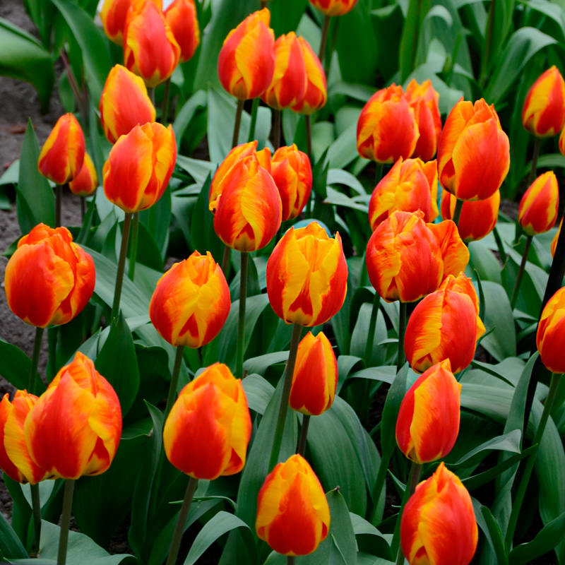 La plantation des tulipes est un jeu d’enfants ! Ce sont des bulbeuses très faciles à réussir qui se plaisent dans tout sol pour peu qu’il soit drainant car elles redoutent les excès d’eau. Si votre terre est trop lourde, faites un apport de sable ou de terreau pour l’alléger et en améliorer le drainage. Les tulipes apprécient les expositions ensoleillées, mais se plairont aussi dans des endroits mi-ensoleillés du jardin. Réservez-leur un endroit abrité des vents forts, surtout pour les variétés les plus hautes. Les tulipes se plantent à l’automne, et ont besoin de passer l’hiver en terre pour bien fleurir le printemps suivant. Plantez vos bulbes, pointe vers le haut, dans une terre bien ameublie, à environ 12 / 15 cm de profondeur. Pour les tulipes botaniques, dont les bulbes sont généralement plus petits, plantez moins profond. D’une manière générale, recouvrez vos bulbes sous une épaisseur de terre d’environ 1,5 à 2 fois la hauteur du bulbe. Selon l’effet souhaité, plantez vos bulbes en groupe dense, distancés de 10 à 12 cm environ, pour créer de magnifiques taches de couleurs au jardin. Sinon, plantez de manière plus diffuse et aléatoire à travers vos plates-bandes de vivaces ou de bisannuelles pour un effet plus naturel. Les tulipes peuvent également se planter en pot pour illuminer vos balcons et terrasses. Dans ce cas, choisissez un contenant d’un bon diamètre et d’une bonne profondeur, et positionnez dans le fond un lit de gravier ou de billes d’argiles pour favoriser le drainage. Comme en pleine terre, respectez la bonne profondeur de plantation, et n’hésitez pas à les associer à d’autres bulbes à floraison printanière comme des narcisses, jacinthes, crocus ou encore muscaris. Après la plantation, arrosez pour favoriser la bonne adhérence de la terre autour des bulbes.