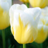 La tulipe Triomphe Calgary Flame est une jolie bulbeuse de 25 cm de hauteur, qui s’épanouit en avril, en dévoilant une floraison en coupe resserrée de 7 cm de diamètre, au coloris blanc pur flammé de jaune.