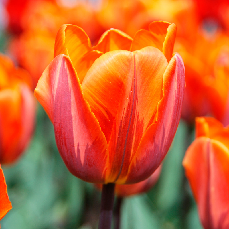 La tulipe Triomphe Princesse Irène est une jolie bulbeuse de 35 cm de hauteur, qui s’épanouit en avril, en dévoilant une floraison en coupe resserrée de 7 cm de diamètre, au coloris orange flammé marron et pourpre. Avec sa grande tige bien droite, elle sera sublime en massif ou plate-bande, pour créer une tache de couleur spectaculaire ou pour donner de la hauteur de manière plus diffuse et naturelle à une composition de vivaces de printemps ou de bisannuelles. En grand pot, elle sublimera vos balcons et terrasses en association avec d’autres bulbeuses à floraison printanière comme les muscaris ou les narcisses grande coupe. En vase, cette tulipe Triomphe fera entrer une note de fraicheur printanière dans votre intérieur.