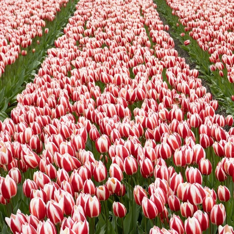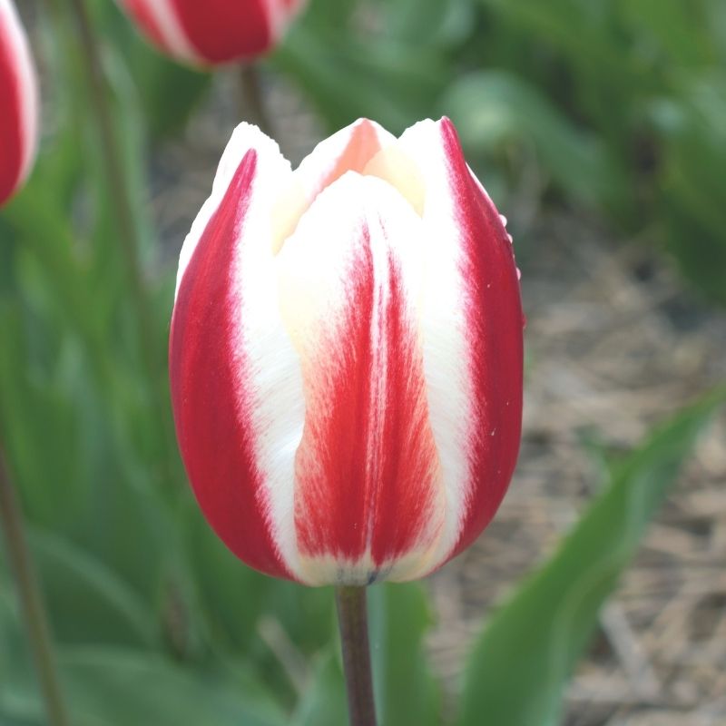 La tulipe Triomphe Spring Surprise est une jolie bulbeuse de 45 cm de hauteur, qui s’épanouit en avril, en dévoilant une floraison en coupe resserrée de 7 cm de diamètre, au coloris rouge bordé bordé blanc crème. Avec sa grande tige bien droite, elle sera sublime en massif ou plate-bande, pour créer une tache de couleur spectaculaire ou pour donner de la hauteur de manière plus diffuse et naturelle à une composition de vivaces de printemps ou de bisannuelles. En grand pot, elle sublimera vos balcons et terrasses en association avec d’autres bulbeuses à floraison printanière comme les muscaris ou les narcisses grande coupe. En vase, cette tulipe Triomphe fera entrer une note de fraicheur printanière dans votre intérieur.