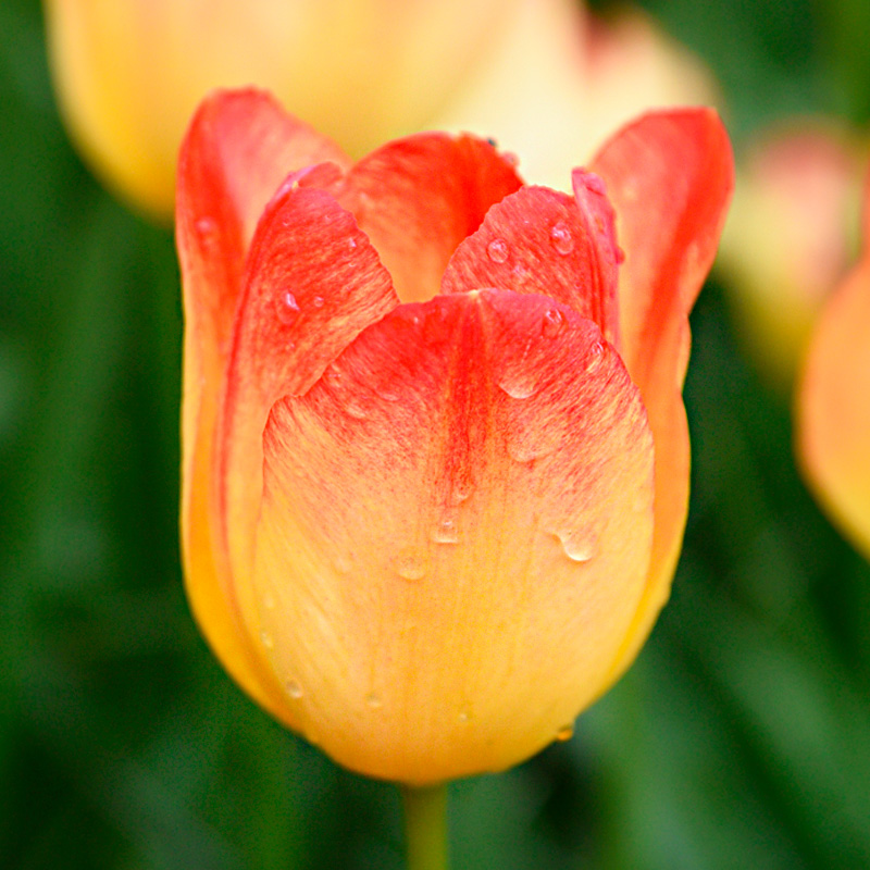 La plantation des tulipes est un jeu d’enfants ! Ce sont des bulbeuses très faciles à réussir qui se plaisent dans tout sol pour peu qu’il soit drainant car elles redoutent les excès d’eau. Si votre terre est trop lourde, faites un apport de sable ou de terreau pour l’alléger et en améliorer le drainage. Les tulipes apprécient les expositions ensoleillées, mais se plairont aussi dans des endroits mi-ensoleillés du jardin. Réservez-leur un endroit abrité des vents forts, surtout pour les variétés les plus hautes. Les tulipes se plantent à l’automne, et ont besoin de passer l’hiver en terre pour bien fleurir le printemps suivant. Plantez vos bulbes, pointe vers le haut, dans une terre bien ameublie, à environ 12 / 15 cm de profondeur. Pour les tulipes botaniques, dont les bulbes sont généralement plus petits, plantez moins profond. D’une manière générale, recouvrez vos bulbes sous une épaisseur de terre d’environ 1,5 à 2 fois la hauteur du bulbe. Selon l’effet souhaité, plantez vos bulbes en groupe dense, distancés de 10 à 12 cm environ, pour créer de magnifiques taches de couleurs au jardin. Sinon, plantez de manière plus diffuse et aléatoire à travers vos plates-bandes de vivaces ou de bisannuelles pour un effet plus naturel. Les tulipes peuvent également se planter en pot pour illuminer vos balcons et terrasses. Dans ce cas, choisissez un contenant d’un bon diamètre et d’une bonne profondeur, et positionnez dans le fond un lit de gravier ou de billes d’argiles pour favoriser le drainage. Comme en pleine terre, respectez la bonne profondeur de plantation, et n’hésitez pas à les associer à d’autres bulbes à floraison printanière comme des narcisses, jacinthes, crocus ou encore muscaris. Après la plantation, arrosez pour favoriser la bonne adhérence de la terre autour des bulbes.