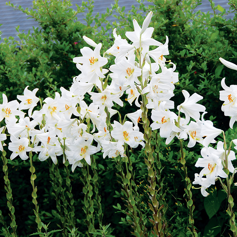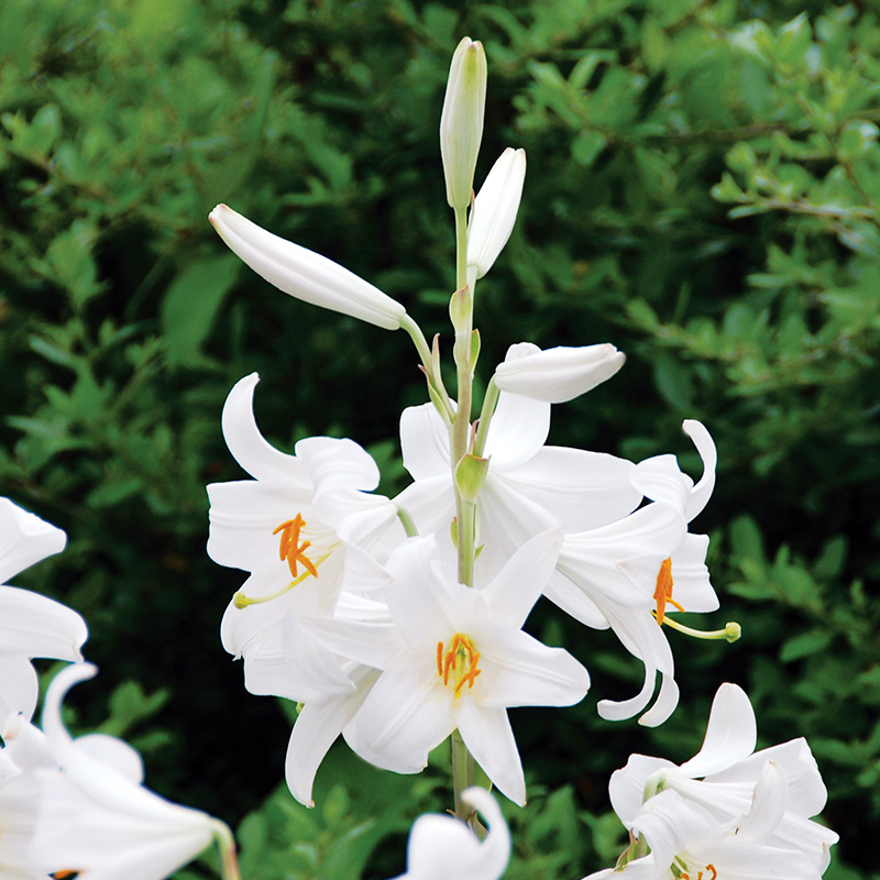 Le Lis candidum (Lis De La Madone) est une bulbeuse vivace spectaculaire de 140 à 150 cm de hauteur, qui produit en juin juillet une tige élancée comportant un bouquet de 5 à 7 fleurs en trompette étoilée de 12 à 15 cm de diamètre au coloris blanc pur.