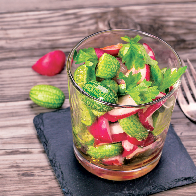 Concombre miniature de la taille d’une olive. Variété grimpante très productive. A consommer cru ou mariné en conserve.