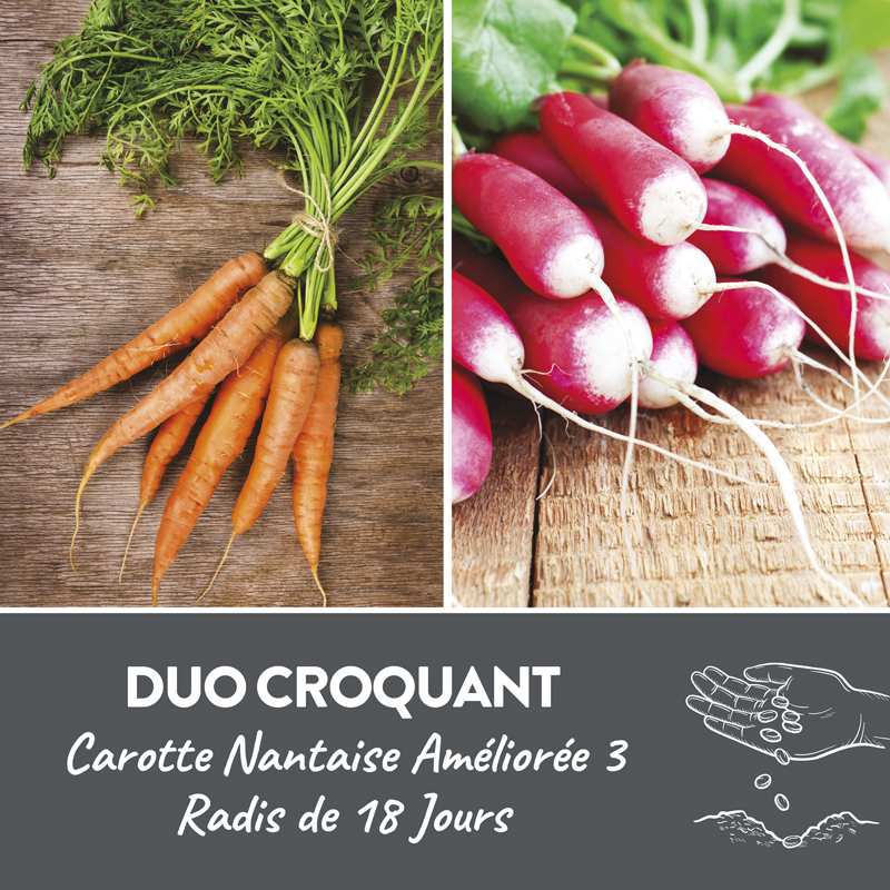 Le Duo croquant présemé bio est composé de carotte ‘Nantaise améliorée 3’ et de radis ‘De 18 jours’. Le radis garde l’humidité du sol qui permet à la carotte de germer. Il marque aussi le rang jusqu’à la levée des carottes. Ce duo est parfait pour préparer vos apéritifs croquants. La carotte Nantaise Améliorée 3 produit des racines demi-longues, cylindrique, peu élargie du collet, et à bout arrondi de couleur orange. Sa chair rouge lui donne une saveur douce et sucrée, ce qui la rend parfaite pour la confection de gâteau. Dotée d’une peau très fine, et d’un feuillage peu développé, cette variété très productive est idéale pour la production d’été. La carotte est un légume incontournable du potager familial tout simplement car c’est l’un des légumes les plus consommés au monde, mais aussi car sa culture est plutôt simple. La carotte n’exige pas un sol en particulier, même s’ il est vrai que vous aurez un meilleur rendement dans un sol léger, sablonneux et frais. Une fois récoltées, les carottes se conservent assez bien dans du sable dans un endroit frais, sec et bien aéré. Vous pouvez également les conserver une fois cuites au congélateur ou dans des bocaux stérilisés. En cuisine, la carotte se prépare de 1001 façons, crues en bâtonnet pour l’apéritif ou râpées ; cuites à l’eau ou à la vapeur, en garniture dans des plats mijotés comme un bœuf bourguignon, en soupe, et même en gâteau ! Le Radis De 18 Jours est une variété très précoce que vous pouvez semer dès le mois de février sous châssis ou sous tunnel. Sa croissance est très rapide, pensez à bien arroser les futurs radis pour éviter qu’ils ne creusent. Les racines de cette variété sont demi-longues à grands bouts blancs et à collets rosé-carminé. Idéal à déguster frais tout simplement avec du pain et du beurre. Ce sachet contient 2 rubans de graines de 1m.