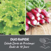 Le Duo rapide présemé bio est composé de salade ‘Dorée de Printemps’ et de radis de ’18 jours’. Ce duo est fait pour les jardiniers novices et/ou impatients. Ce sont des variétés particulièrement précoces. Le nom ‘ de 18 jours’ indique qu’on peut récolter le radis 18 jours après son semis. Ces classiques ne perdent pour autant ni de leur saveur ni de leur croquant malgré leur croissance rapide. Ce sachet contient 2 rubans de graines de 1m.