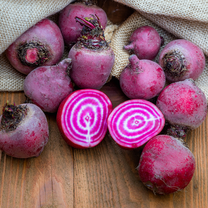 La betterave Chioggia est une variété précoce et surprenante originaire d’Italie. Elle forme des racines bien rondes de couleur rose. Une fois coupée en deux elle nous dévoile sa grande originalité avec sa chair rose veinée de blanc. C’est d’ailleurs pour son aspect très décoratif qu’elle est appréciée en cuisine, puisqu’elle décorera n’importe quel plat. Attention, utilisez crue pour un meilleur effet, car elle perd sa couleur à la cuisson. Mais ne vous détrompez pas, elle est aussi belle que bonne, grâce à son bon goût sucré. De culture facile, la betterave est peu exigeante et accepte tout type de sol. Elle est aussi assez résistante aux maladies et parasites. Cependant, la betterave craint la sécheresse, donc n’hésitez pas à pailler les pieds pour garder le sol frais, vos betteraves conserveront ainsi leur qualité gustative. Elle craint aussi le gel, donc veillez à ne pas les planter trop tôt en pleine terre, et à ne pas les récolter trop tard. Offrant un fort rendement, vous ne saurez vite plus quoi en faire. N’hésitez donc pas à les conserver dans des bocaux stérilisés et/ou au congélateur une fois cuites. Les betteraves se consomment la majorité du temps en salade après cuisson à l’eau, mais vous pouvez aussi manger les jeunes feuilles. Cette variété est savoureuse crue, en carpaccio assaisonné de vinaigrette ; cuite, en salade, chips ou en accompagnement de poisson.