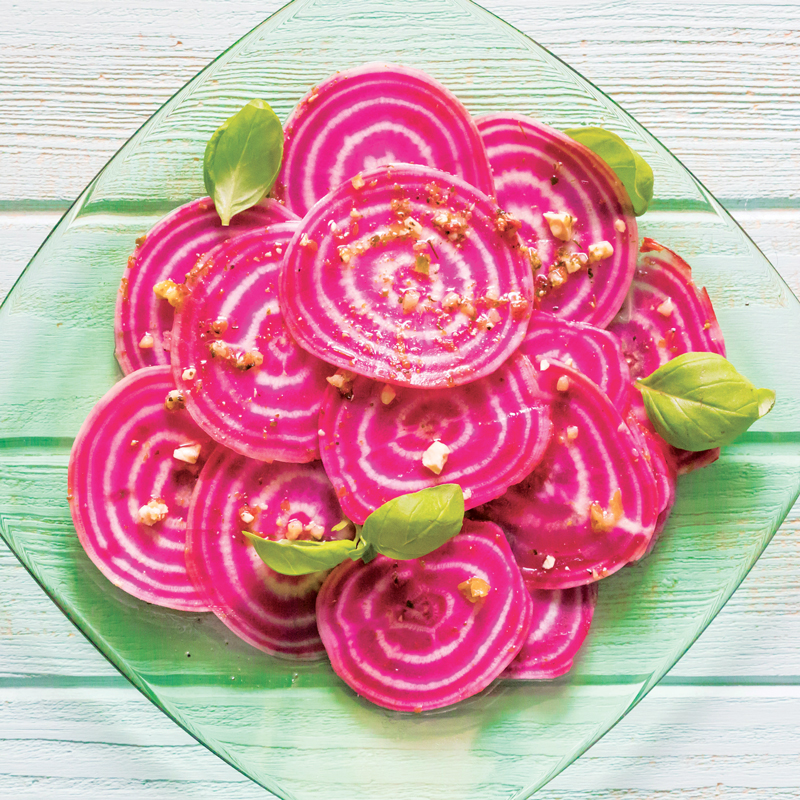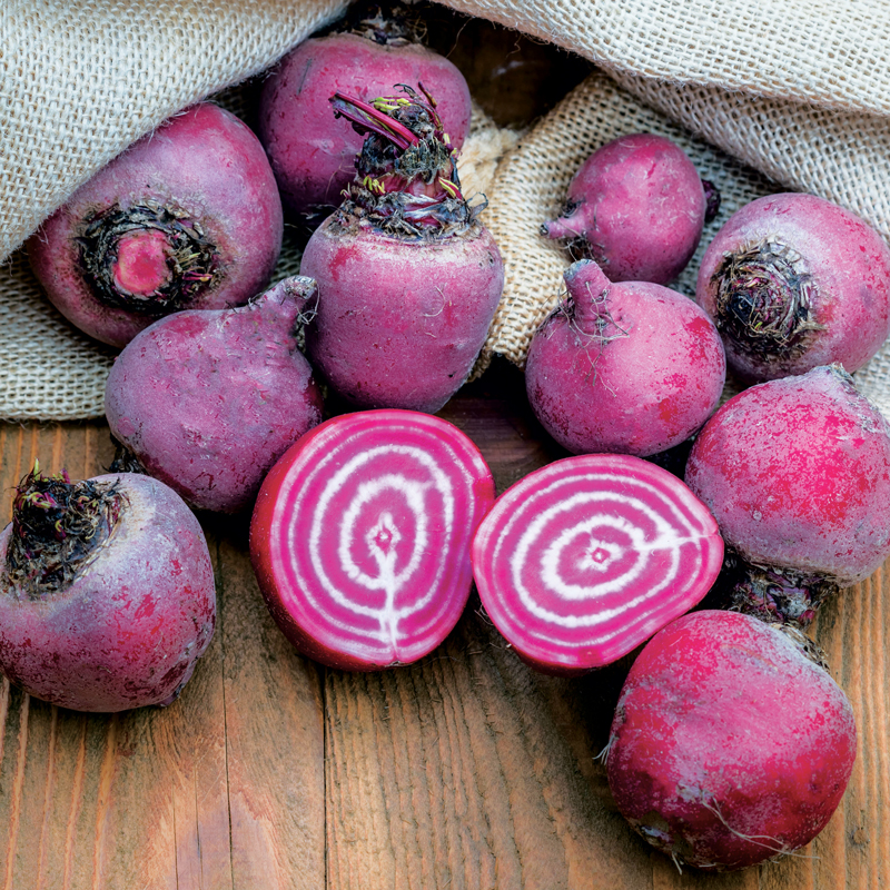 La Betterave potagère Chioggia présemé bio est une variété précoce et surprenante originaire d’Italie. Elle forme des racines bien rondes de couleur rose. Une fois coupée en deux elle nous dévoile sa grande originalité avec sa chair rose veinée de blanc. C’est d’ailleurs pour son aspect très décoratif qu’elle est appréciée en cuisine, puisqu’elle décorera n’importe quel plat. Attention, utilisez crue pour un meilleur effet, car elle perd sa couleur à la cuisson. Mais ne vous détrompez pas, elle est aussi belle que bonne, grâce à son bon goût sucré. De culture facile, la betterave est peu exigeante et accepte tout type de sol. Elle est aussi assez résistante aux maladies et parasites. Cependant, la betterave craint la sécheresse, donc n’hésitez pas à pailler les pieds pour garder le sol frais, vos betteraves conserveront ainsi leur qualité gustative. Elle craint aussi le gel, donc veillez à ne pas les planter trop tôt en pleine terre, et à ne pas les récolter trop tard. Offrant un fort rendement, vous ne saurez vite plus quoi en faire. N’hésitez donc pas à les conserver dans des bocaux stérilisés et/ou au congélateur une fois cuites. Les betteraves se consomment la majorité du temps en salade après cuisson à l’eau, mais vous pouvez aussi manger les jeunes feuilles. Cette variété est savoureuse crue, en carpaccio assaisonné de vinaigrette ; cuite, en salade, chips ou en accompagnement de poisson. Ce sachet contient 1 ruban de 2 m.
