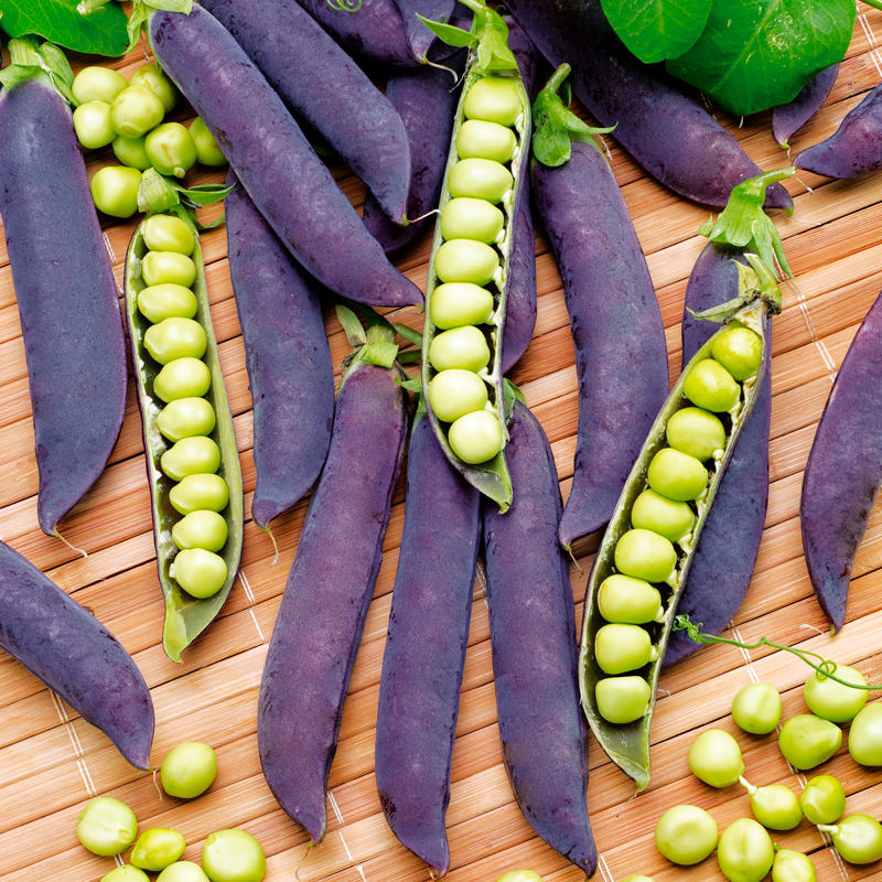 Le Pois est une plante potagère annuelle qui tient son origine très ancienne du Proche Orient. C’est l’un des plus vieux légumes cultivés en Europe et en Asie. Le Pois à rames produit des cosses remplies de grains ronds lisses ou ridés. Leur cosse n’est pas consommable c’est pourquoi ils se cuisinent après avoir été écossés. Le pois à rames Blauwschokker est une variété originaire de Hollande qui produit des cosses violettes et des fleurs roses lilas. Elle peut monter jusqu’à 2m de haut. Chacune de ses gousses contient entre 7 et 10 graines vert bleutées. Cette variété produit énormément sur une longue période.