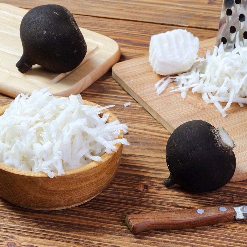 Racine noire à chair blanche, ronde et ferme d’environ 8 cm de diamètre. Variété d’automne résistante au froid.