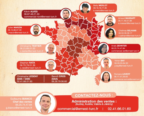 Les marques, « Ernest TURC » et « Ferme de Sainte Marthe » sont présentes dans les réseaux GSS/GSB (Grande Surface Spécialisé et Grande Surface de Bricolage), « Ernest au jardin » pour les réseaux GSA (Grande Surface Alimentaire). Ernest TURC conçoit et réalise également pour ses clients des gammes de bulbes et de semences en MDD (marques de distributeurs). Accompagné par une force commerciale de plus de 10 collaborateurs, terrain et sédentaires, Ernest TURC apporte à ses clients un service sur-mesure et un accompagnement professionnel adapté aux saisons et aux produits. Les gammes, ainsi que les marques, sont sans cesse renouvelées et adaptées au marché actuel. L’entreprise met à disposition de ses clients des supports de vente pour aiguiller et orienter le consommateur en magasin.